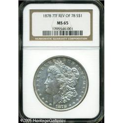 <B>1878 7TF<img border='0' src='http://www.heritagecoins.com/images/star.gif' width=10 height=10>$1 Reverse of 1878 MS65 NGC.</B></I> The obverse is essentially untoned, while the reverse features golden-brown centers framed by a narrow ring of cobalt-blue and magenta patina. Well struck and minimally abraded. Lot:9877