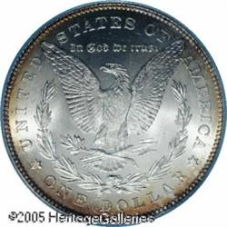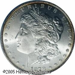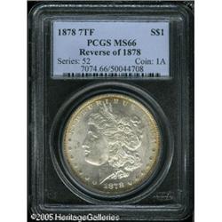 <B>1878 7TF<img border='0' src='http://www.heritagecoins.com/images/star.gif' width=10 height=10>$1 Reverse of 1878 MS66 PCGS.</B></I> Very similar to the MS66 we offered in our May Long Beach Sale, this piece also has bright, lustrous surfaces that are encircled by light orange-gold toning. Fully struck, as one would expect, with only the slightest abrasions and luster grazes present. A lovely 7 Tailfeather dollar. Population: 18 in 66, 0 finer (1/05).<BR><I>From The Banks Collection.</B></I> Lot:9881