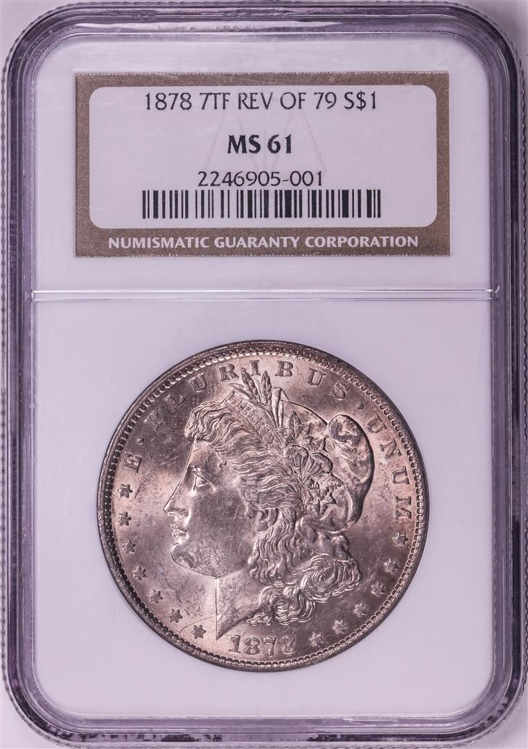 One 1878 7TF Reverse of 79 $1 Morgan Silver Dollar Coin NGC MS61. NGC Certified.