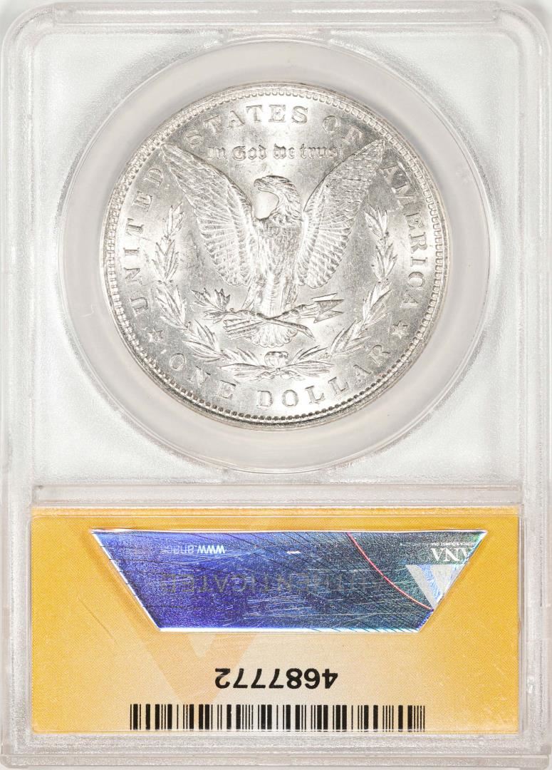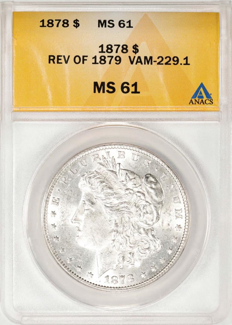 One 1878 7TF Reverse of 79 VAM-229.1 $1 Morgan Silver Dollar Coin ANACS MS61. ANACS Certified.
