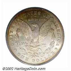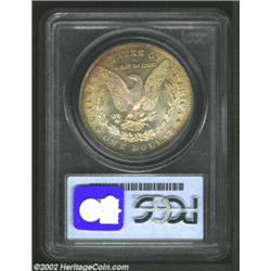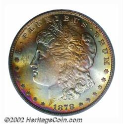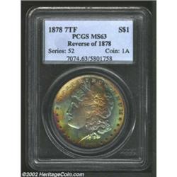 1878 7TF S$1 Reverse of 1878 MS63 PCGS. While a common coin in this grade, this piece is uncommonly attractive. The obverse has bright, frosted mint luster and that side is covered with the most incredible rainbow toning imaginable. The toning also does an excellent job of concealing the numerous small abrasions that account for the technical grade. The reverse is also bright and lustrous with a light accent of golden color. Important notice: We expect to be auctioning lots at the rate of 200-250 per hour. Sometimes eBay Premier live bid software cannot keep up with that pace, so we strongly recommend that you place a realistic proxy bid now as insurance to avoid disappointment. Also please note that all Heritage/CAA lots purchased through eBay Premier carry a 20% Buyer's Premium. Please make sure you read the Terms and Conditions.