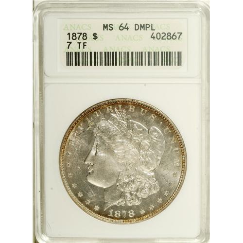 <B>1878 7TF S$1 Reverse of 1878 MS64 Deep Mirror Prooflike ANACS.</B></I> The crisply struck devices have pleasing frost, and both sides exhibit strong see-oneself mirrors. Gold-orange patina graces the rims.<BR><BR><b>Shipping:</b> Coins & Currency (<a target="_blank" href="http://www.heritageauctions.com/common/shipping.php">view shipping information</a>)