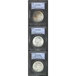 1878 7TF S$1 Reverse of 1878 MS64 PCGS, well struck and lustrous with light silver-gray patina; 1880 MS64 PCGS, lovely golden-brown and rose-violet patina, well preserved, the W in WE is die doubled; and an 1880 MS64 PCGS, lustrous, bold, and clean, the first 8 in the date is recut, struck from lightly clashed dies. 3 coins Important notice: We expect to be auctioning lots at the rate of 200-250 per hour. Sometimes eBay Premier live bid software cannot keep up with that pace, so we strongly recommend that you place a realistic proxy bid now as insurance to avoid disappointment. Also please note that all Heritage/CAA lots purchased through eBay Premier carry a 20% Buyer's Premium. Please make sure you read the Terms and Conditions.