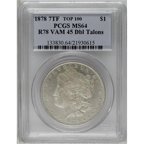 <B>1878 7TF<img border='0' src='http://www.heritagecoins.com/images/star.gif' width=10 height=10>$1> Reverse of 1878 MS64 PCGS.</B></I> VAM-45. A Top 100 Variety. According to the <I>Top 100</B></I> guide this is an extremely rare variety with fewer than two dozen examples known in all grades. A lovely dollar with light contrast between the lustrous devices and reflective fields. Lightly toned in silver-gray shades.