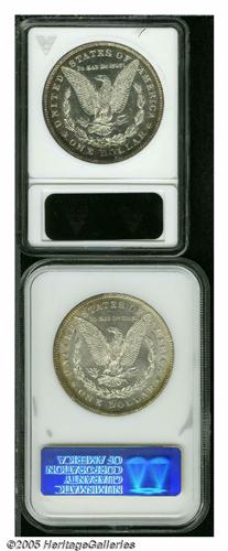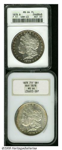 <B>1878 7TF<S$1> Reverse of 1878 MS64 Prooflike ANACS,</B></I> VAM-43, A Hot 50 Variety, the eagle's legs are die doubled, peripheral rose-gold color, a nearly immaculate cheek, beautiful mirrored fields; and an <B>1878 7TF Reverse of 1878 MS64 NGC,</B></I> blushes of golden-brown and navy-blue toning clean to the borders.
