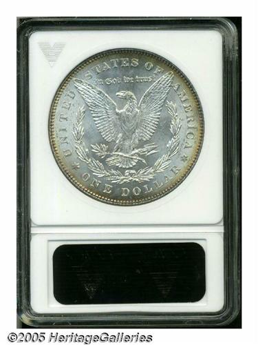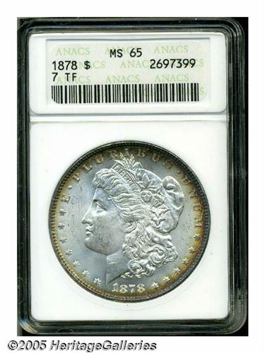 <B>1878 7TF<S$1> Reverse of 1878 MS65 ANACS.</B></I> Rich golden-brown and electric-blue colors fill the margins of this meticulously struck and strongly shimmering Gem. LIBERTY is die doubled left. A splendid example of the ephemeral Second Reverse, long nock subtype.