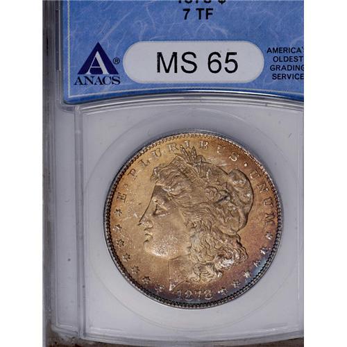 <B>1878 7TF<img border='0' src='http://www.heritagecoins.com/images/star.gif' width=10 height=10>$1> Reverse of 1878 MS65 ANACS.</B></I> The obverse has bronze toning with hints of lavender, while the reverse has bronze rim toning. A sharply struck and lustrous Gem.