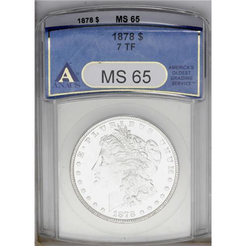 <B>1878 7TF<img border='0' src='http://www.heritagecoins.com/images/star.gif' width=10 height=10>$1> Reverse of 1878 MS65 ANACS.</B></I> VAM-84. A trace of a letter E is present left of the wreath ribbon loop, and the L in LIBERTY is washed out. This untoned, well struck, and highly lustrous Gem is a worthy addition to an 1878 VAM collection. <BR><BR><B>Important notice:</B> Heritage usually auctions material at the rate of 200-250 lots per hour. On some occasions eBay Live bid software or the Internet may not be able to keep up with the pace of the auction. We recommend placing a realistic absentee bid now as insurance to avoid disappointment. Occasionally the auctioneer may eliminate or reject an eBay Live bid, and the auctioneer may also reopen a lot after the close of the eBay live bidding (usually because we missed an audience bid), and may reject your bid even if it shows you as the winning bidder. By bidding via eBay Live, you agree that Heritage may award the lot to another bidder at its sole discretion under the circumstances described above or any other reasonable circumstances. Since eBay bids are not shown to us until we open the lot on the floor, we treat those bids just like floor bids. In most cases the floor responds before the eBay bid is presented to us, due to Internet lag time, so for consistency we have made it a policy that floor bids are always considered first over tie eBay live bids. Also please note that all Heritage lots purchased through eBay Live carry a 20% Buyer's Premium. Please make sure you read the Terms and Conditions before you bid. This lot is being auctioned in conjunction with a live floor auction by Heritage Galleries & Auctioneers. All final auction and invoice information will be supplied by Heritage Galleries & Auctioneers, and all other information should be considered preliminary. Lot:3193 <BR><BR><B>Winning Notification and Billing:</B> After the FINAL session in this auction is complete, Heritage will send e-mail and snail mail invoices. This process normally takes several days. All final auction and invoice information will be supplied by Heritage Galleries & Auctioneers, and all other information should be considered preliminary. <BR><BR>This auction will be conducted on a live auction floor and over the Internet through eBay Live. If you choose to place an absentee bid, please take a moment to <font color='#0000ff'><u><a href='http://pages.ebay.com/liveauctions/help/before/laabsentee.html'>learn how eBay Live absentee bidding works</a></u></font><font color='#000000'>