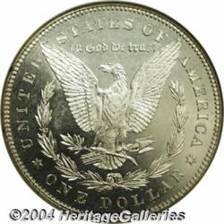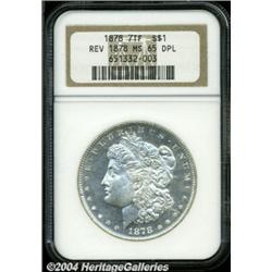 <B>1878 7TF<S$1> Reverse of 1878 MS65 Deep Mirror Prooflike NGC.</B></I> While Bowers (1993) states that some "Prooflike" examples of this variety display that feature on only one side, the present Gem displays mirrored fields on both the obverse and the reverse. The devices are well frosted in finish with crisp delineation between all features. There are few abrasions of any size--an uncommon feature for the issue. Population: 9 in MS65 DPL, 0 finer (7/04). <BR><BR><B>Important notice:</B> Heritage usually auctions material at the rate of 200-250 lots per hour. On some occasions eBay Live bid software or the Internet may not be able to keep up with the pace of the auction. We recommend placing a realistic absentee bid now as insurance to avoid disappointment. Occasionally the auctioneer may eliminate or reject an eBay Live bid, and the auctioneer may also reopen a lot after the close of the eBay live bidding (usually because we missed an audience bid), and may reject your bid even if it shows you as the winning bidder. By bidding via eBay Live, you agree that Heritage may award the lot to another bidder at its sole discretion under the circumstances described above or any other reasonable circumstances. Since eBay bids are not shown to us until we open the lot on the floor, we treat those bids just like floor bids. In most cases the floor responds before the eBay bid is presented to us, due to Internet lag time, so for consistency we have made it a policy that floor bids are always considered first over tie eBay live bids. Also please note that all Heritage lots purchased through eBay Live carry a 20% Buyer's Premium. Please make sure you read the Terms and Conditions before you bid. </span></font></tr></table></td></tr></table>