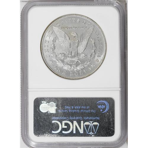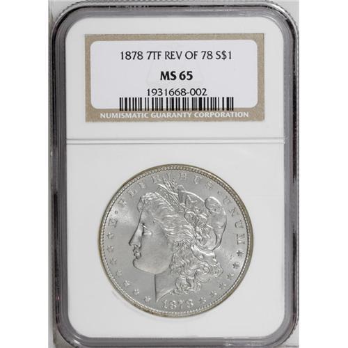 <B>1878 7TF<img border='0' src='http://www.heritagecoins.com/images/star.gif' width=10 height=10>$1> Reverse of 1878 MS65 NGC.</B></I> Lightly toned ice-blue and olive-green in areas, with subtle and somewhat reflective luster. A boldly struck coin with clean devices befitting Gem status.