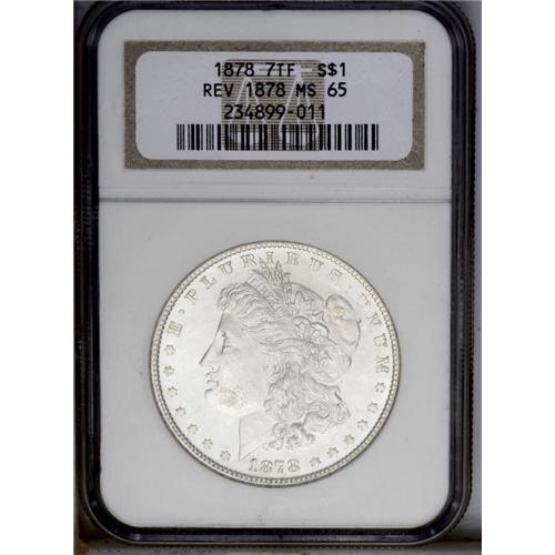 <B>1878 7TF<img border='0' src='http://www.heritagecoins.com/images/star.gif' width=10 height=10>$1> Reverse of 1878 MS65 NGC.</B></I> Sharply defined and brilliant silver-white with no more marks than one might expect for the Gem grade. <BR><BR><B>Important notice:</B> Heritage usually auctions material at the rate of 200-250 lots per hour. On some occasions eBay Live bid software or the Internet may not be able to keep up with the pace of the auction. We recommend placing a realistic absentee bid now as insurance to avoid disappointment. Occasionally the auctioneer may eliminate or reject an eBay Live bid, and the auctioneer may also reopen a lot after the close of the eBay live bidding (usually because we missed an audience bid), and may reject your bid even if it shows you as the winning bidder. By bidding via eBay Live, you agree that Heritage may award the lot to another bidder at its sole discretion under the circumstances described above or any other reasonable circumstances. Since eBay bids are not shown to us until we open the lot on the floor, we treat those bids just like floor bids. In most cases the floor responds before the eBay bid is presented to us, due to Internet lag time, so for consistency we have made it a policy that floor bids are always considered first over tie eBay live bids. Also please note that all Heritage lots purchased through eBay Live carry a 20% Buyer's Premium. Please make sure you read the Terms and Conditions before you bid. This lot is being auctioned in conjunction with a live floor auction by Heritage Galleries & Auctioneers. All final auction and invoice information will be supplied by Heritage Galleries & Auctioneers, and all other information should be considered preliminary. Lot:3196 <BR><BR><B>Winning Notification and Billing:</B> After the FINAL session in this auction is complete, Heritage will send e-mail and snail mail invoices. This process normally takes several days. All final auction and invoice information will be supplied by Heritage Galleries & Auctioneers, and all other information should be considered preliminary. <BR><BR>This auction will be conducted on a live auction floor and over the Internet through eBay Live. If you choose to place an absentee bid, please take a moment to <font color='#0000ff'><u><a href='http://pages.ebay.com/liveauctions/help/before/laabsentee.html'>learn how eBay Live absentee bidding works</a></u></font><font color='#000000'>