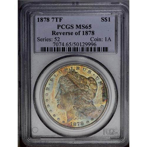 <B>1878 7TF<img border='0' src='http://www.heritagecoins.com/images/star.gif' width=10 height=10>$1> Reverse of 1878 MS65 PCGS.</B></I> Golden-brown, aquamarine, and plum colors adorn this lustrous example. A bagmark on the chin is not conspicuous. <BR><BR><B>Important notice:</B> Heritage usually auctions material at the rate of 200-250 lots per hour. On some occasions eBay Live bid software or the Internet may not be able to keep up with the pace of the auction. We recommend placing a realistic absentee bid now as insurance to avoid disappointment. Occasionally the auctioneer may eliminate or reject an eBay Live bid, and the auctioneer may also reopen a lot after the close of the eBay live bidding (usually because we missed an audience bid), and may reject your bid even if it shows you as the winning bidder. By bidding via eBay Live, you agree that Heritage may award the lot to another bidder at its sole discretion under the circumstances described above or any other reasonable circumstances. Since eBay bids are not shown to us until we open the lot on the floor, we treat those bids just like floor bids. In most cases the floor responds before the eBay bid is presented to us, due to Internet lag time, so for consistency we have made it a policy that floor bids are always considered first over tie eBay live bids. Also please note that all Heritage lots purchased through eBay Live carry a 20% Buyer's Premium. Please make sure you read the Terms and Conditions before you bid. This lot is being auctioned in conjunction with a live floor auction by Heritage Galleries & Auctioneers. All final auction and invoice information will be supplied by Heritage Galleries & Auctioneers, and all other information should be considered preliminary. Lot:3195 <BR><BR><B>Winning Notification and Billing:</B> After the FINAL session in this auction is complete, Heritage will send e-mail and snail mail invoices. This process normally takes several days. All final auction and invoice information will be supplied by Heritage Galleries & Auctioneers, and all other information should be considered preliminary. <BR><BR>This auction will be conducted on a live auction floor and over the Internet through eBay Live. If you choose to place an absentee bid, please take a moment to <font color='#0000ff'><u><a href='http://pages.ebay.com/liveauctions/help/before/laabsentee.html'>learn how eBay Live absentee bidding works</a></u></font><font color='#000000'>
