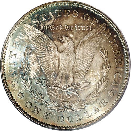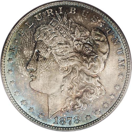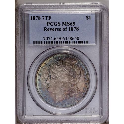<B>1878 7TF<img border='0' src='http://www.heritagecoins.com/images/star.gif' width=10 height=10>$1> Reverse of 1878 MS65 PCGS.</B></I> Rich layers of lilac-gray and turquoise toning over both sides indicate many years of paper envelope storage. The number of Gem available of this first year variety drops dramatically from lesser Uncirculated grades and those with the character of this colorful example are in great demand. <BR><BR><B>Important notice:</B> Heritage usually auctions material at the rate of 200-250 lots per hour. On some occasions eBay Live bid software or the Internet may not be able to keep up with the pace of the auction. We recommend placing a realistic absentee bid now as insurance to avoid disappointment. Occasionally the auctioneer may eliminate or reject an eBay Live bid, and the auctioneer may also reopen a lot after the close of the eBay live bidding (usually because we missed an audience bid), and may reject your bid even if it shows you as the winning bidder. By bidding via eBay Live, you agree that Heritage may award the lot to another bidder at its sole discretion under the circumstances described above or any other reasonable circumstances. Since eBay bids are not shown to us until we open the lot on the floor, we treat those bids just like floor bids. In most cases the floor responds before the eBay bid is presented to us, due to Internet lag time, so for consistency we have made it a policy that floor bids are always considered first over tie eBay live bids. Also please note that all Heritage lots purchased through eBay Live carry a 20% Buyer's Premium. Please make sure you read the Terms and Conditions before you bid. This lot is being auctioned in conjunction with a live floor auction by Heritage Galleries & Auctioneers. All final auction and invoice information will be supplied by Heritage Galleries & Auctioneers, and all other information should be considered preliminary. Lot:3192 <BR><BR><B>Winning Notification and Billing:</B> After the FINAL session in this auction is complete, Heritage will send e-mail and snail mail invoices. This process normally takes several days. All final auction and invoice information will be supplied by Heritage Galleries & Auctioneers, and all other information should be considered preliminary. <BR><BR>This auction will be conducted on a live auction floor and over the Internet through eBay Live. If you choose to place an absentee bid, please take a moment to <font color='#0000ff'><u><a href='http://pages.ebay.com/liveauctions/help/before/laabsentee.html'>learn how eBay Live absentee bidding works</a></u></font><font color='#000000'>