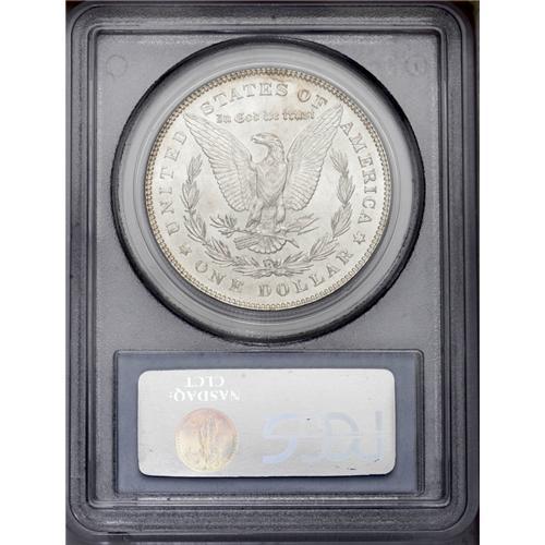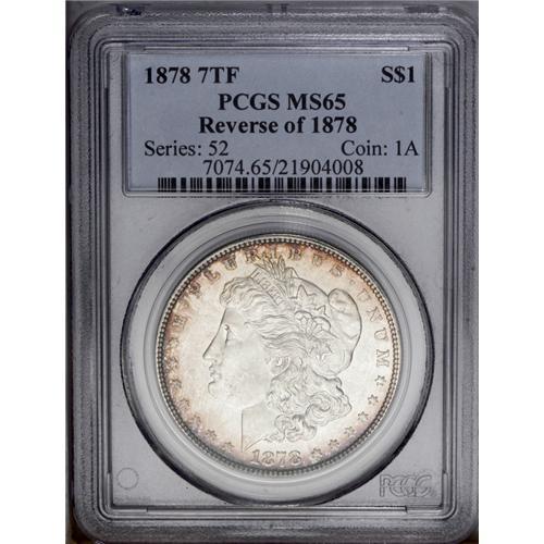 <B>1878 7TF<img border='0' src='http://www.heritagecoins.com/images/star.gif' width=10 height=10>$1> Reverse of 1878 MS65 PCGS.</B></I> The surfaces are enlivened with sparkling luster, and display whispers of purple, cobalt-blue, and reddish-tan patination along the obverse margins. Great definition is apparent on t he design elements, including the hair over Liberty's ear and the eagle's breast feathers. Minute contact marks on the cheek and scuffs in the left obverse field are mentioned for accuracy. Only 18 pieces have been certified finer by PCGS (3/06). <BR><BR><B>Important notice:</B> Heritage usually auctions material at the rate of 200-250 lots per hour. On some occasions eBay Live bid software or the Internet may not be able to keep up with the pace of the auction. We recommend placing a realistic absentee bid now as insurance to avoid disappointment. Occasionally the auctioneer may eliminate or reject an eBay Live bid, and the auctioneer may also reopen a lot after the close of the eBay live bidding (usually because we missed an audience bid), and may reject your bid even if it shows you as the winning bidder. By bidding via eBay Live, you agree that Heritage may award the lot to another bidder at its sole discretion under the circumstances described above or any other reasonable circumstances. Since eBay bids are not shown to us until we open the lot on the floor, we treat those bids just like floor bids. In most cases the floor responds before the eBay bid is presented to us, due to Internet lag time, so for consistency we have made it a policy that floor bids are always considered first over tie eBay live bids. Also please note that all Heritage lots purchased through eBay Live carry a 20% Buyer's Premium. Please make sure you read the Terms and Conditions before you bid. This lot is being auctioned in conjunction with a live floor auction by Heritage Galleries & Auctioneers. All final auction and invoice information will be supplied by Heritage Galleries & Auctioneers, and all other information should be considered preliminary. Lot:3194 <BR><BR><B>Winning Notification and Billing:</B> After the FINAL session in this auction is complete, Heritage will send e-mail and snail mail invoices. This process normally takes several days. All final auction and invoice information will be supplied by Heritage Galleries & Auctioneers, and all other information should be considered preliminary. <BR><BR>This auction will be conducted on a live auction floor and over the Internet through eBay Live. If you choose to place an absentee bid, please take a moment to <font color='#0000ff'><u><a href='http://pages.ebay.com/liveauctions/help/before/laabsentee.html'>learn how eBay Live absentee bidding works</a></u></font><font color='#000000'>