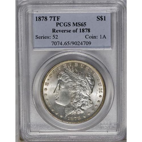 <B>1878 7TF<img border='0' src='http://www.heritagecoins.com/images/star.gif' width=10 height=10>$1> Reverse of 1878 MS65 PCGS.</B></I> Well struck with attractive luster. Champagne rim toning is the only color on the otherwise untoned surfaces. Only tiny abrasions appear on this Gem.<BR><I>From The Chicago-Ark Collection.</B></I>