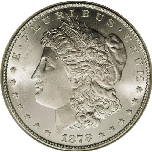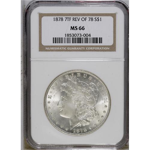 <B>1878 7TF S$1 Reverse of 1878 MS66 NGC.</B></I> This lustrous and nearly untoned first-year Premium Gem has pleasantly smooth fields, and the cheek is also impressively void of bagmarks. The Seven Tailfeather, Reverse of 1878 subtype is also referred to as the Second Reverse. Although the Philadelphia Mint abandoned the reverse in 1878, San Francisco used in 1879, and Carson City struck it on two 1880-CC VAMs. Census: 23 in 66, 0 finer (10/06).<BR><BR><b>Shipping:</b> Coin/Currency (<a target="_blank" href="http://www.heritageauctions.com/common/shipping.php">view shipping information</a>)