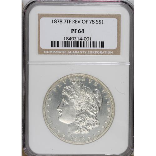 <B>1878 7TF S$1 Reverse of 1878 PR64 NGC.</B></I> An estimated 250 to 300 proof 7 Tail Feathers Reverse of 1878 dollars were struck, with many unsold pieces being melted (David Bowers, 2006). Brilliant surfaces on the near-Gem for sale in this lot exhibit sharply struck devices, including excellent delineation in the hair over Liberty's ear, a characteristic uncommon to this variety (David Bowers, 2005). Moreover, noticeable field-motif contrast is evident when the coin is titled under a light source, another attribute ordinarily not seen on this issue. A few wispy handling marks define the grade.<BR><BR><b>Shipping:</b> Coins & Currency (<a target="_blank" href="http://www.heritageauctions.com/common/shipping.php">view shipping information</a>)