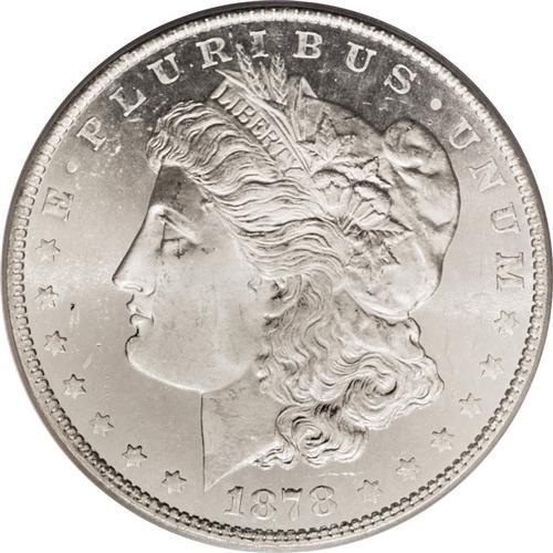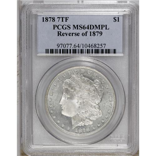 <B>1878 7TF<img border='0' src='http://www.heritagecoins.com/images/star.gif' width=10 height=10>$1> Reverse of 1879 MS64 Deep Mirror Prooflike PCGS.</B></I> While widely recognized and collected today, this has not always been the case. In the 1960s and on into the early 1970s, little was known about the different reverse hubs used on 1878 dollars. This coin was struck from the round breast design that remained on Morgan dollars until 1904. Deep Mirror Prooflike pieces are especially difficult, and PCGS has only certified 20 Gems with four coins finer (9/06). Brilliant throughout, the fields show illimitable depth of reflectivity with starkly contrasting frosted devices. Intricately detailed with no obvious or mentionable abrasions.
