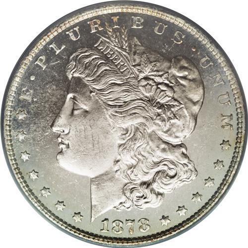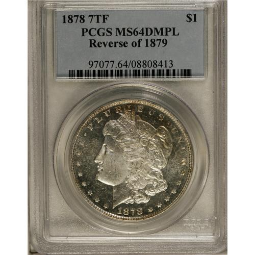 <B>1878 7TF S$1 Reverse of 1879 MS64 Deep Mirror Prooflike PCGS.</B></I> Frosty devices contrast nicely with the deeply reflective fields of this near-Gem. The effect is virtually black and white, although gold and magenta toning can be seen on and near Liberty's Phrygian cap and in the reverse peripheries. A few abrasions limit the grade, yet this piece is quite scarce even in MS64 with deep mirror contrast. Population: 20 in 64, 4 finer (10/06).<BR><BR><b>Shipping:</b> Coin/Currency (<a target="_blank" href="http://www.heritageauctions.com/common/shipping.php">view shipping information</a>)