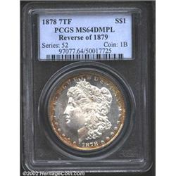 1878 7TF S$1 Reverse of 1879 MS64 Deep Mirror Prooflike PCGS. A very scarce DMPL variety and seldom seen in such a superior grade. Fully struck, the fields are deeply mirrored with noticeable mint frost over the devices. Brilliant in the centers with a rich ring of golden-brown patina around the margins. Important notice: We expect to be auctioning lots at the rate of 200-250 per hour. Sometimes eBay Premier live bid software cannot keep up with that pace, so we strongly recommend that you place a realistic proxy bid now as insurance to avoid disappointment. Also please note that all Heritage/CAA lots purchased through eBay Premier carry a 20% Buyer's Premium. Please make sure you read the Terms and Conditions.