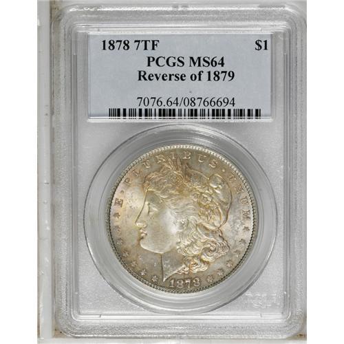 <B>1878 7TF<img border='0' src='http://www.heritagecoins.com/images/star.gif' width=10 height=10>$1> Reverse of 1879 MS64 PCGS.</B></I> A frosty near-Gem example with lovely gold and iridescent overtones, especially vivid on the obverse. Sharply struck with outstanding surfaces for the grade.