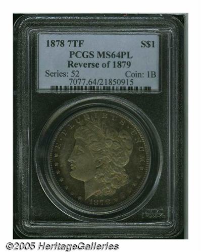 <B>1878 7TF<S$1> Reverse of 1879 MS64 Prooflike PCGS.</B></I> Rich forest-green, gold, and rose-red colors adorn this unabraded example. Luster intermittently emerges from the deep patination. Population: 36 in 64, 5 finer (5/05).