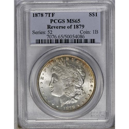 <B>1878 7TF<img border='0' src='http://www.heritagecoins.com/images/star.gif' width=10 height=10>$1> Reverse of 1879 MS65 PCGS.</B></I> Golden-orange toning covers much of the periphery, leaving a brilliant center. This lustrous and well struck Gem shows few marks.<BR><I>From The Chicago-Ark Collection.</B></I>