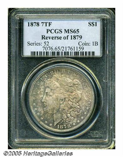 <B>1878 7TF<S$1> Reverse of 1879 MS65 PCGS.</B></I> Rich golden-russet, olive-green, and navy-blue colors consume this well struck and satiny Gem. Only a thorough inspection of the reverse can locate even the most trivial contact, and the obverse is also clean. 1878 Silver Dollars are popularly collected by VAM variety, and when greater attention is focused on the Reverse of 1879 instead of the earlier subtypes, high grade examples may become the target of accumulations.