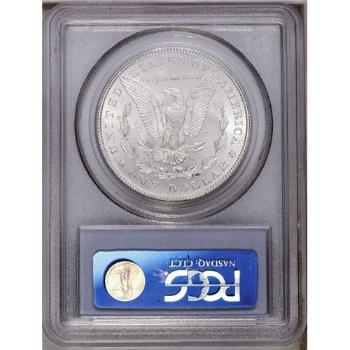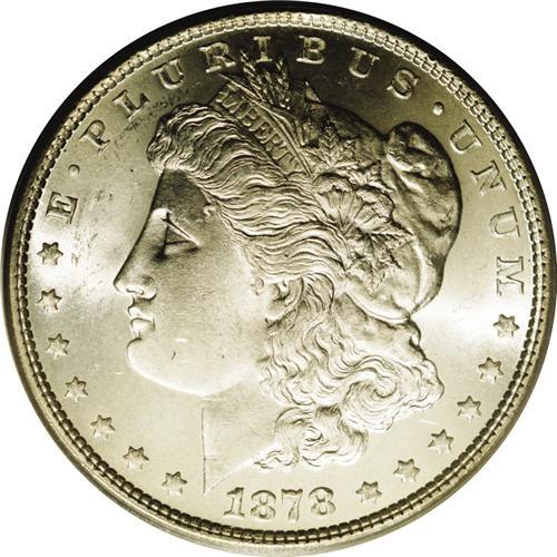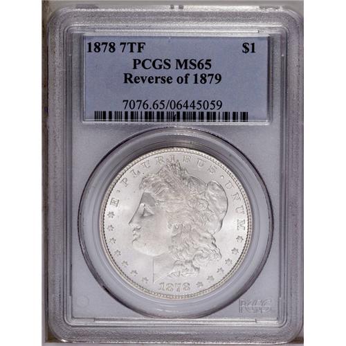 <B>1878 7TF<img border='0' src='http://www.heritagecoins.com/images/star.gif' width=10 height=10>$1> Reverse of 1879 MS65 PCGS.</B></I> The 7 Tail Feathers Reverse of 1879 has rounded breast feathers on the eagle--unlike the flat feathers on the 7 Tail Feathers Reverse of 1878--and the arrow feathers are slanted rather than parallel as on the '78 reverse. Bowers' silver dollar <I>Guide Book</B></I> estimates that only about one coin out of six of the 7 Feathers variety is the Reverse of 1879, noting that "Even today, the price of the 1878 with Reverse of 1879, although considerably higher than that of the earlier style, does not reflect the true differential in rarity." This lovely Gem example is brilliant on both sides and has frosty luster over minimally abraded surfaces. The eagle's breast feathers are well rounded indeed, and show virtually no contact. The strike is full and well executed. Light clash marks are seen on the reverse. An interesting and historic issue, as well as a good candidate for a Gem first-year type set! PCGS has graded six Reverse of '79 examples finer (3/06). <BR><BR><B>Important notice:</B> Heritage usually auctions material at the rate of 200-250 lots per hour. On some occasions eBay Live bid software or the Internet may not be able to keep up with the pace of the auction. We recommend placing a realistic absentee bid now as insurance to avoid disappointment. Occasionally the auctioneer may eliminate or reject an eBay Live bid, and the auctioneer may also reopen a lot after the close of the eBay live bidding (usually because we missed an audience bid), and may reject your bid even if it shows you as the winning bidder. By bidding via eBay Live, you agree that Heritage may award the lot to another bidder at its sole discretion under the circumstances described above or any other reasonable circumstances. Since eBay bids are not shown to us until we open the lot on the floor, we treat those bids just like floor bids. In most cases the floor responds before the eBay bid is presented to us, due to Internet lag time, so for consistency we have made it a policy that floor bids are always considered first over tie eBay live bids. Also please note that all Heritage lots purchased through eBay Live carry a 20% Buyer's Premium. Please make sure you read the Terms and Conditions before you bid. This lot is being auctioned in conjunction with a live floor auction by Heritage Galleries & Auctioneers. All final auction and invoice information will be supplied by Heritage Galleries & Auctioneers, and all other information should be considered preliminary. Lot:3198 <BR><BR><B>Winning Notification and Billing:</B> After the FINAL session in this auction is complete, Heritage will send e-mail and snail mail invoices. This process normally takes several days. All final auction and invoice information will be supplied by Heritage Galleries & Auctioneers, and all other information should be considered preliminary. <BR><BR>This auction will be conducted on a live auction floor and over the Internet through eBay Live. If you choose to place an absentee bid, please take a moment to <font color='#0000ff'><u><a href='http://pages.ebay.com/liveauctions/help/before/laabsentee.html'>learn how eBay Live absentee bidding works</a></u></font><font color='#000000'>