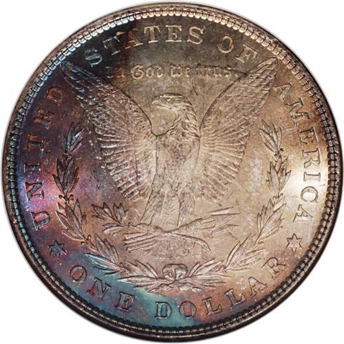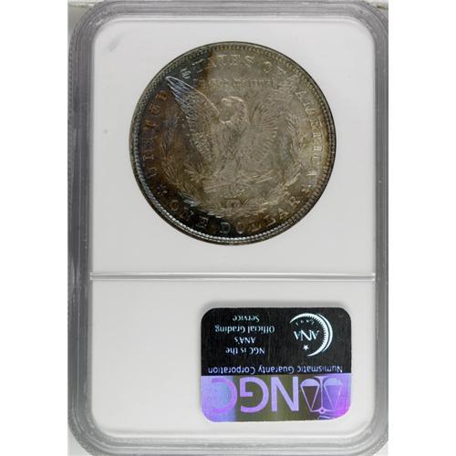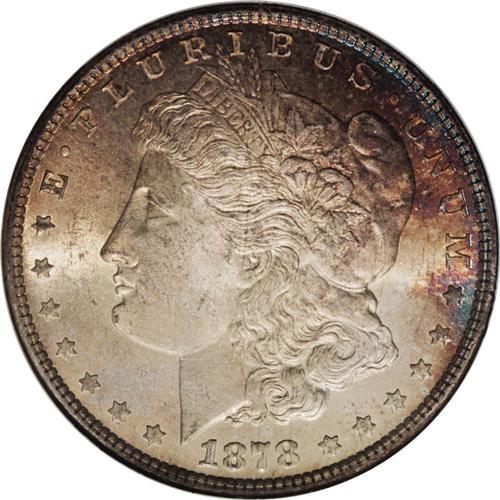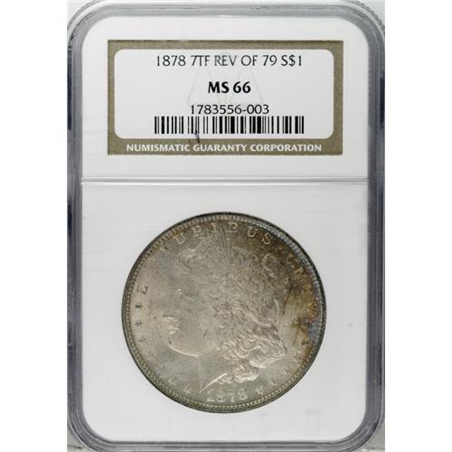 <B>1878 7TF S$1 Reverse of 1879 MS66 NGC.</B></I> The Reverse of 1879, with slanting arrow feather, likely comprises less than 20% of the total 1878 7 Tail Feathers specimens known. The grading services have recognized only a few Premium Gem MS66 examples of this variety today, with no Superb Gem specimens graded. This is from the third hub, which made its debut later in the year. The example offered here is aesthetically desirable with vivid gold, russet, and bright blue toning. A splendid example for the toning enthusiast. Population: 11 in 66, 0 finer (11/06).<BR><BR><b>Shipping:</b> Coin/Currency (<a target="_blank" href="http://www.heritageauctions.com/common/shipping.php">view shipping information</a>)