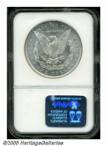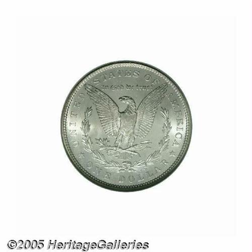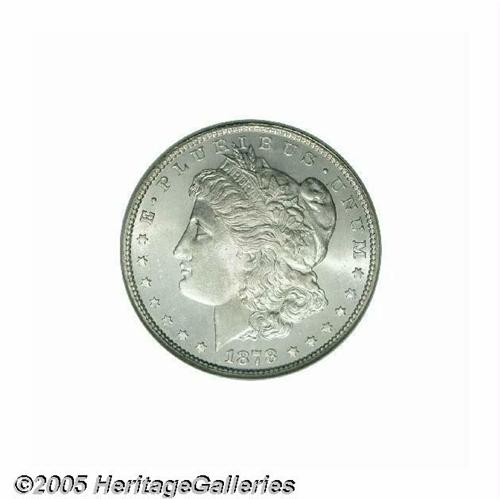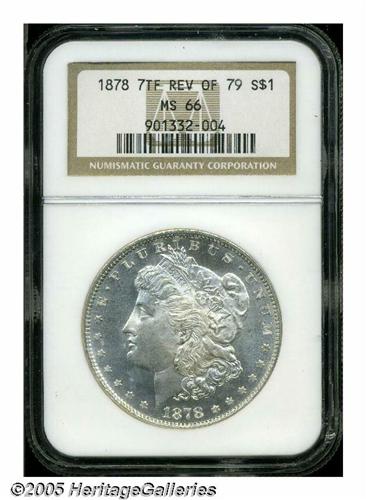 <B>1878 7TF<S$1> Reverse of 1879 MS66 NGC.</B></I> There is some confusion among numismatic scholars about the number of 1878 7TF Morgan Dollars produced with the Reverse of 1879 dies. Walter Breen estimates that 4.3 million of the approximately 9.7 million 1878 7TF Dollars delivered were of the present variety. The estimates given by Wayne Miller and Q. David Bowers, however, total no more than 2 million pieces. Nevertheless, there can be no doubt that the 1878 7TF Reverse of 1879 is scarcer than its similarly dated Reverse of 1878 counterpart at all levels of Mint State preservation. This is a vibrant, frosty textured Gem whose untoned surfaces a bright, snow-white appearance. There are no ill-defined features, and both sides are free of all but a few light grazes. Population: 10 in 66, none are finer (5/05).