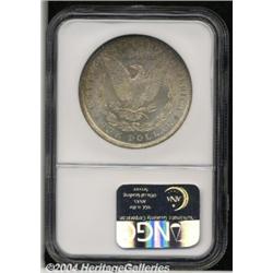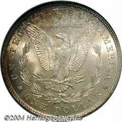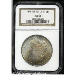 <B>1878 7TF<S$1> Reverse of 1879 MS66 NGC.</B></I> There is some confusion among numismatic scholars about the number of 1878 7TF Morgan Dollars produced with the Reverse of 1879 dies. Walter Breen estimates that 4.3 million of the approximately 9.7 million 1878 7TF Dollars delivered were of the present variety. The estimates given by Wayne Miller and Q. David Bowers, however, total no more than 2 million pieces. Nevertheless, there can be no doubt that the 1878 7TF Reverse of 1879 is scarcer than its similarly dated Reverse of 1878 counterpart at all levels of Mint State preservation. This is a vibrant, frosty textured Gem whose originally toned surfaces reveal delicate golden-orange, magenta, and thalo-blue shadings gaining intensity toward the peripheral areas. There are no ill-defined features, and both sides are free of all but a few light grazes. Population: 8 in 66, 0 finer (6/04). <BR><BR><B>Important notice:</B> Heritage usually auctions material at the rate of 200-250 lots per hour. On some occasions eBay Live bid software or the Internet may not be able to keep up with the pace of the auction. We recommend placing a realistic absentee bid now as insurance to avoid disappointment. Occasionally the auctioneer may eliminate or reject an eBay Live bid, and the auctioneer may also reopen a lot after the close of the eBay live bidding (usually because we missed an audience bid), and may reject your bid even if it shows you as the winning bidder. By bidding via eBay Live, you agree that Heritage may award the lot to another bidder at its sole discretion under the circumstances described above or any other reasonable circumstances. Since eBay bids are not shown to us until we open the lot on the floor, we treat those bids just like floor bids. In most cases the floor responds before the eBay bid is presented to us, due to Internet lag time, so for consistency we have made it a policy that floor bids are always considered first over tie eBay live bids. Also please note that all Heritage lots purchased through eBay Live carry a 20% Buyer's Premium. Please make sure you read the Terms and Conditions before you bid. </span></font></tr></table></td></tr></table>