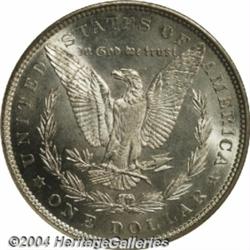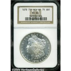 <B>1878 7TF<S$1> Reverse of 1879 MS66 NGC.</B></I> The 1878 7 tail feathers issue was struck in two major reverse variations: the first with parallel top arrow feather, and concave breast on the eagle, often referred to as the Reverse of 1878, and the second variation, referred to as the Reverse of 1879, with a slanting top arrow feather, and convex, or rounded, breast to the eagle. The latter variety is considered to be scarcer in both circulated and Mint State grades. Bowers, in his <I>Silver Dollars and Trade Dollars of the U.S.,</B></I> estimates only 400 to 800 Reverse of 1879 survivors in MS65 or better, versus an estimate of 1,000 to 2,000 MS65 or better Reverse of 1878 survivors. The Reverse of 1879 example we offer here is exquisitely struck, virtually untoned and brilliant, and essentially free of any mentionable marks. This coin is sure to excite the advanced Morgan dollar collector. Population: 8 in 66, 0 finer (7/04). <BR><BR><B>Important notice:</B> Heritage usually auctions material at the rate of 200-250 lots per hour. On some occasions eBay Live bid software or the Internet may not be able to keep up with the pace of the auction. We recommend placing a realistic absentee bid now as insurance to avoid disappointment. Occasionally the auctioneer may eliminate or reject an eBay Live bid, and the auctioneer may also reopen a lot after the close of the eBay live bidding (usually because we missed an audience bid), and may reject your bid even if it shows you as the winning bidder. By bidding via eBay Live, you agree that Heritage may award the lot to another bidder at its sole discretion under the circumstances described above or any other reasonable circumstances. Since eBay bids are not shown to us until we open the lot on the floor, we treat those bids just like floor bids. In most cases the floor responds before the eBay bid is presented to us, due to Internet lag time, so for consistency we have made it a policy that floor bids are always considered first over tie eBay live bids. Also please note that all Heritage lots purchased through eBay Live carry a 20% Buyer's Premium. Please make sure you read the Terms and Conditions before you bid. </span></font></tr></table></td></tr></table>