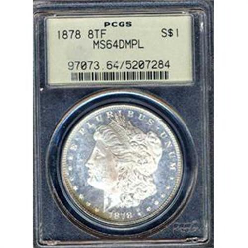 White frosted devices against blazing mirror fields, with only scattered abrasions in the frost restraining the grade to MS64 instead of something higher. A popular first-year issue. The 8 tail feathers motif was quickly surplanted by 7 tail feathers mid-way into 1878.