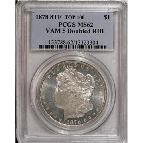 <B>1878 8TF $1 MS62 PCGS.</B></I> Double RIB. VAM-5. Top 100. PCGS Population (1392/5405). NGC Census: (849/3974). Mintage: 699,300. Numismedia Wsl. Price for NGC/PCGS coin in MS62: $120. (#7072)<BR><BR><B>Coin Engraver:</B> George T. Morgan<BR><BR><b>Shipping:</b> Coins & Currency (<a target="_blank" href="http://www.heritageauctions.com/common/shipping.php">view shipping information</a>)