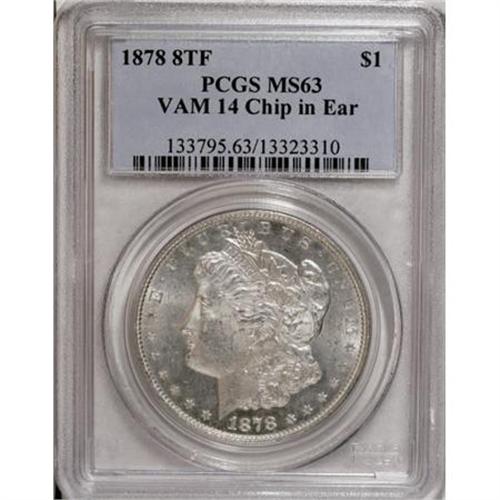 <B>1878 8TF $1 MS63 PCGS.</B></I> VAM-14. Chip in Ear. PCGS Population (2928/2477). NGC Census: (1917/2057). Mintage: 699,300. Numismedia Wsl. Price for NGC/PCGS coin in MS63: $140. (#7072)<BR><BR><B>Coin Engraver:</B> George T. Morgan<BR><BR><b>Shipping:</b> Coins & Currency (<a target="_blank" href="http://www.heritageauctions.com/common/shipping.php">view shipping information</a>)