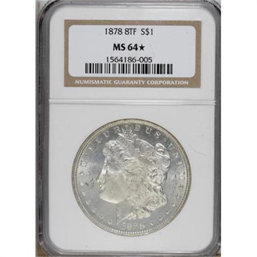 <B>1878 8TF $1 MS64<img border='0' src='http://www.heritagecoins.com/images/star.gif' width=10 height=10> NGC.</B></I> NGC Census: (1673/326). PCGS Population (1963/436). Mintage: 699,300. Numismedia Wsl. Price for NGC/PCGS coin in MS64: $332. (#7072)<BR><BR><b>Shipping:</b> Coins & Currency (<a target="_blank" href="http://www.heritageauctions.com/common/shipping.php">view shipping information</a>)