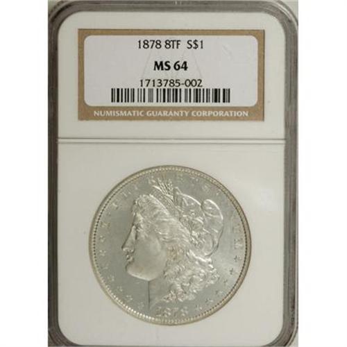 <B>1878 8TF $1 MS64 NGC.</B></I> NGC Census: (1698/340). PCGS Population (1957/442). Mintage: 699,300. Numismedia Wsl. Price for NGC/PCGS coin in MS64: $332. (#7072)<BR><BR><B>Coin Engraver:</B> George T. Morgan<BR><BR><b>Shipping:</b> Coins & Currency (<a target="_blank" href="http://www.heritageauctions.com/common/shipping.php">view shipping information</a>)