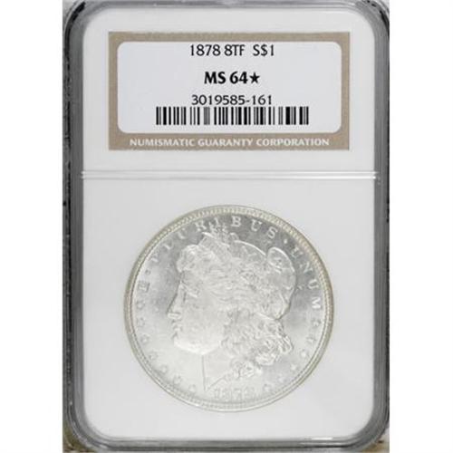 <B>1878 8TF $1 MS64</B></I><img src="/images/star.gif" width="10" height="10" alt="" border="0"><B> NGC.</B></I> NGC Census: (1707/335). PCGS Population (1997/452). Mintage: 699,300. Numismedia Wsl. Price for NGC/PCGS coin in MS64: $332. (#7072)<BR><BR><B>Coin Engraver:</B> George T. Morgan<BR><BR><b>Shipping:</b> Coins & Currency (<a target="_blank" href="http://www.heritageauctions.com/common/shipping.php">view shipping information</a>)