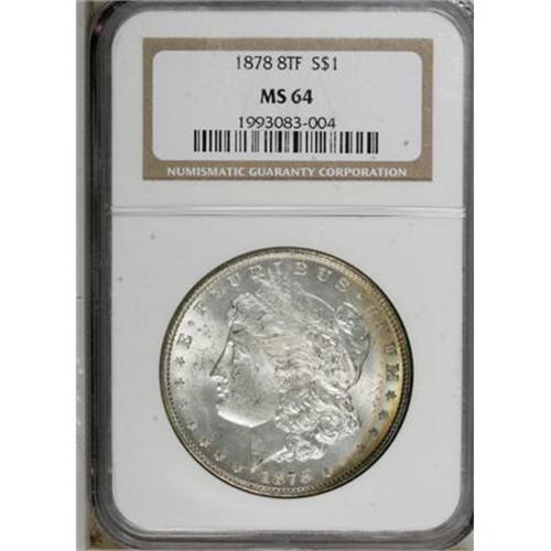 <B>1878 8TF $1 MS64 NGC.</B></I> NGC Census: (1708/335). PCGS Population (2000/455). Mintage: 699,300. Numismedia Wsl. Price for NGC/PCGS coin in MS64: $332. (#7072)<BR><BR><B>Coin Engraver:</B> George T. Morgan<BR><BR><b>Shipping:</b> Coins & Currency (<a target="_blank" href="http://www.heritageauctions.com/common/shipping.php">view shipping information</a>)