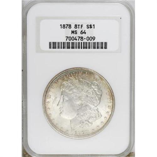 <B>1878 8TF $1 MS64 NGC.</B></I> NGC Census: (1708/336). PCGS Population (2002/456). Mintage: 699,300. Numismedia Wsl. Price for NGC/PCGS coin in MS64: $332. (#7072)<BR><BR><B>Coin Engraver:</B> George T. Morgan<BR><BR><b>Shipping:</b> Coins & Currency (<a target="_blank" href="http://www.heritageauctions.com/common/shipping.php">view shipping information</a>)