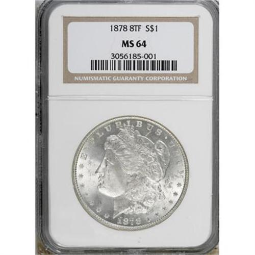 <B>1878 8TF $1 MS64 NGC.</B></I> NGC Census: (1711/338). PCGS Population (2005/458). Mintage: 699,300. Numismedia Wsl. Price for NGC/PCGS coin in MS64: $332. (#7072)<BR><BR><B>Coin Engraver:</B> George T. Morgan<BR><BR><b>Shipping:</b> Coins & Currency (<a target="_blank" href="http://www.heritageauctions.com/common/shipping.php">view shipping information</a>)
