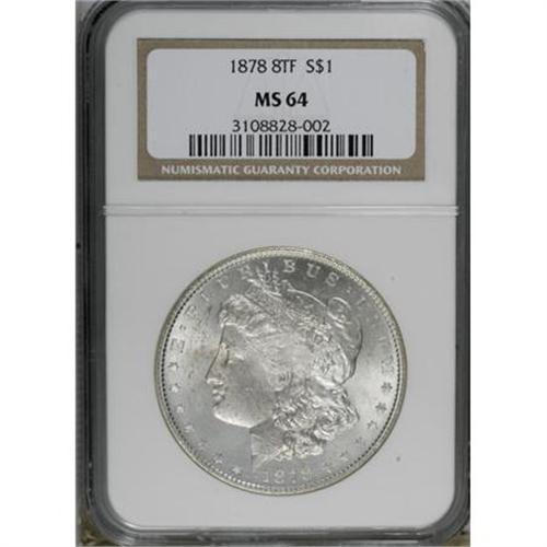 <B>1878 8TF $1 MS64 NGC.</B></I> . NGC Census: (1714/342). PCGS Population (2020/463). Mintage: 699,300. Numismedia Wsl. Price for NGC/PCGS coin in MS64: $340. (#7072)<BR><BR><B>Coin Engraver:</B> George T. Morgan<BR><BR><b>Shipping:</b> Coins & Currency (<a target="_blank" href="http://www.heritageauctions.com/common/shipping.php">view shipping information</a>)
