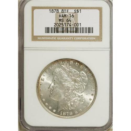 <B>1878 8TF $1 MS64 NGC.</B></I> VAM-16. NGC Census: (1716/346). PCGS Population (2041/468). Mintage: 699,300. Numismedia Wsl. Price for NGC/PCGS coin in MS64: $340. (#7072)<BR><BR><B>Coin Engraver:</B> George T. Morgan<BR><BR><b>Shipping:</b> Coins & Currency (<a target="_blank" href="http://www.heritageauctions.com/common/shipping.php">view shipping information</a>)