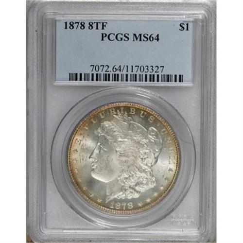 <B>1878 8TF $1 MS64 PCGS.</B></I> PCGS Population (1948/439). NGC Census: (1687/339). Mintage: 699,300. Numismedia Wsl. Price for NGC/PCGS coin in MS64: $332. (#7072)<BR><BR><B>Coin Engraver:</B> George T. Morgan<BR><BR><b>Shipping:</b> Coins & Currency (<a target="_blank" href="http://www.heritageauctions.com/common/shipping.php">view shipping information</a>)