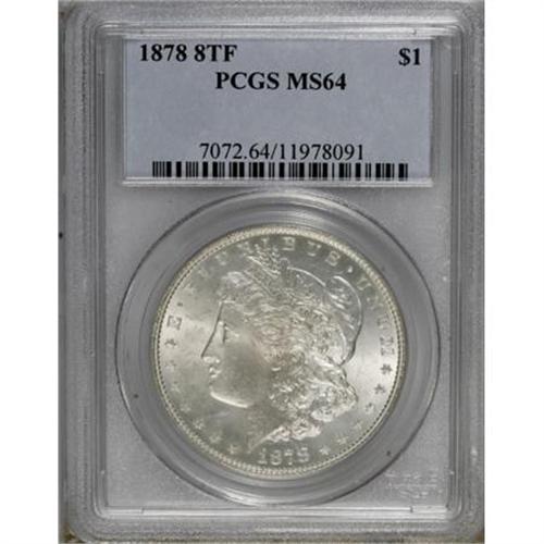 <B>1878 8TF $1 MS64 PCGS.</B></I> PCGS Population (2023/465). NGC Census: (1716/343). Mintage: 699,300. Numismedia Wsl. Price for NGC/PCGS coin in MS64: $340. (#7072)<BR><BR><B>Coin Engraver:</B> George T. Morgan<BR><BR><b>Shipping:</b> Coins & Currency (<a target="_blank" href="http://www.heritageauctions.com/common/shipping.php">view shipping information</a>)
