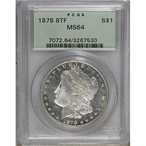 <B>1878 8TF $1 MS64 PCGS.</B></I> PCGS Population (2042/467). NGC Census: (1716/346). Mintage: 699,300. Numismedia Wsl. Price for NGC/PCGS coin in MS64: $340. (#7072)<BR><BR><B>Coin Engraver:</B> George T. Morgan<BR><BR><b>Shipping:</b> Coins & Currency (<a target="_blank" href="http://www.heritageauctions.com/common/shipping.php">view shipping information</a>)