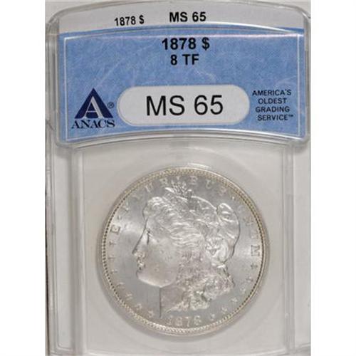 <B>1878 8TF $1 MS65 ANACS.</B></I> NGC Census: (328/17). PCGS Population (433/32). Mintage: 699,300. Numismedia Wsl. Price for NGC/PCGS coin in MS65: $1,050. (#7072)<BR><BR><B>Coin Engraver:</B> George T. Morgan<BR><BR><b>Shipping:</b> Coins & Currency (<a target="_blank" href="http://www.heritageauctions.com/common/shipping.php">view shipping information</a>)