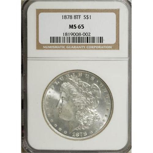 <B>1878 8TF $1 MS65 NGC.</B></I> VAM-17. Brilliant white surfaces with a satiny appearance in the fields. The strike is sharp and both sides are free of significant flaws.<BR><BR><B>Coin Engraver:</B> George T. Morgan<BR><BR><b>Shipping:</b> Coins & Currency (<a target="_blank" href="http://www.heritageauctions.com/common/shipping.php">view shipping information</a>)