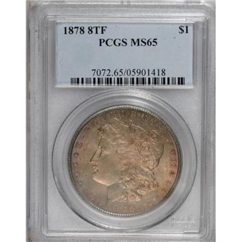 <B>1878 8TF $1 MS65 PCGS.</B></I> VAM-21. Light peach-gray dominates the obverse, although the margin offers cherry-wine and powder-blue shades. The reverse is principally brilliant. A satiny Gem with well struck centers and minor incompleteness on the claws and lower wreath.<BR><BR><B>Coin Engraver:</B> George T. Morgan<BR><BR><b>Shipping:</b> Coins & Currency (<a target="_blank" href="http://www.heritageauctions.com/common/shipping.php">view shipping information</a>)